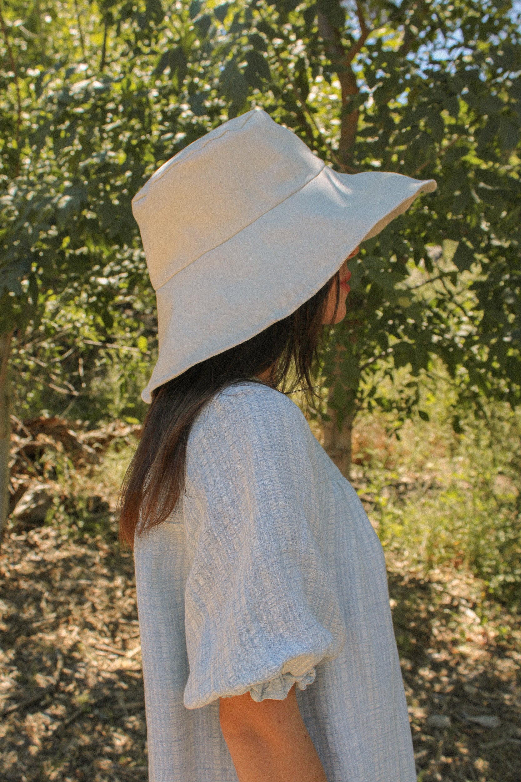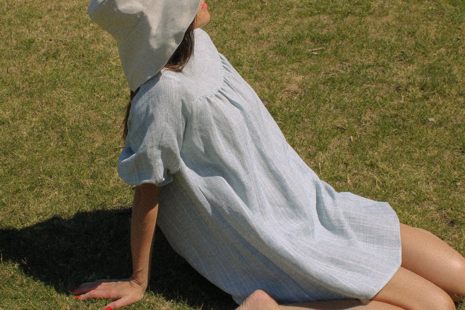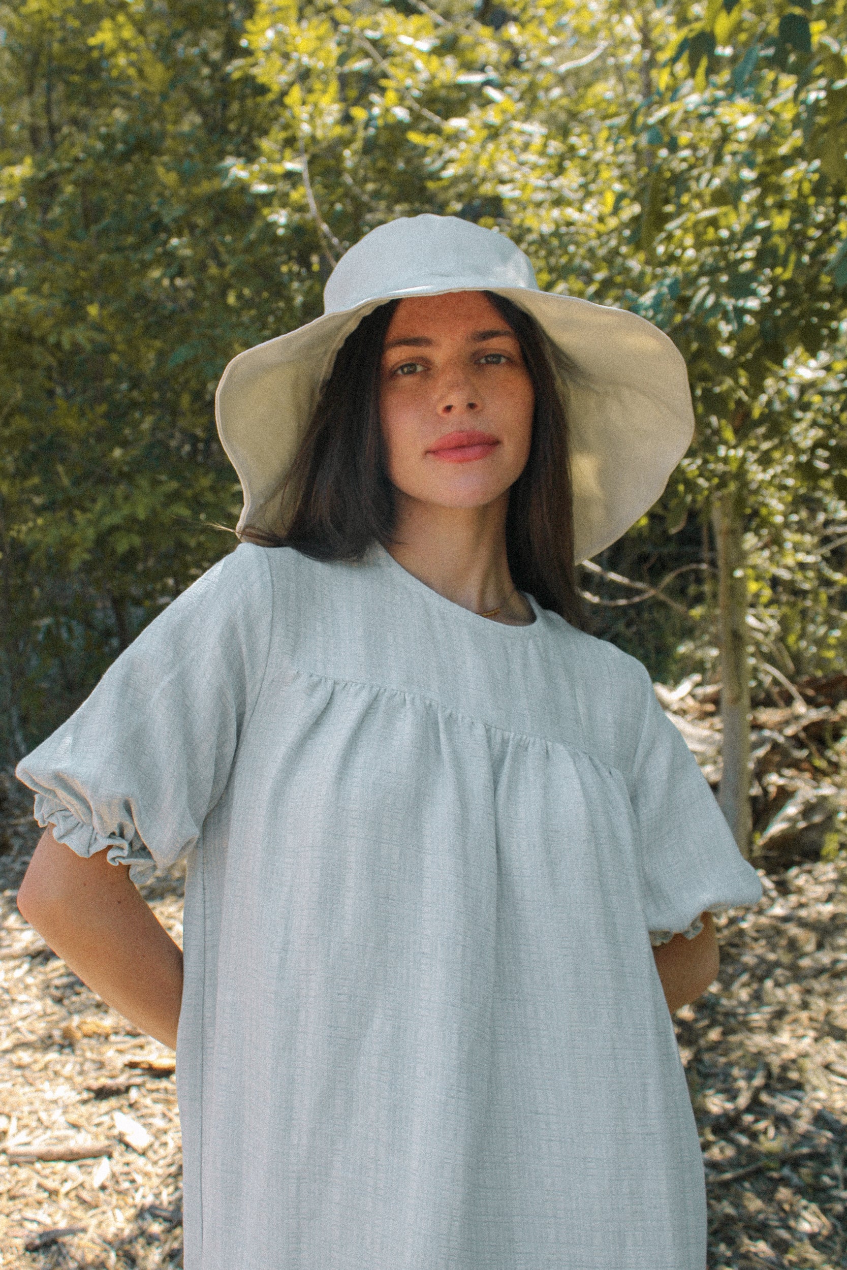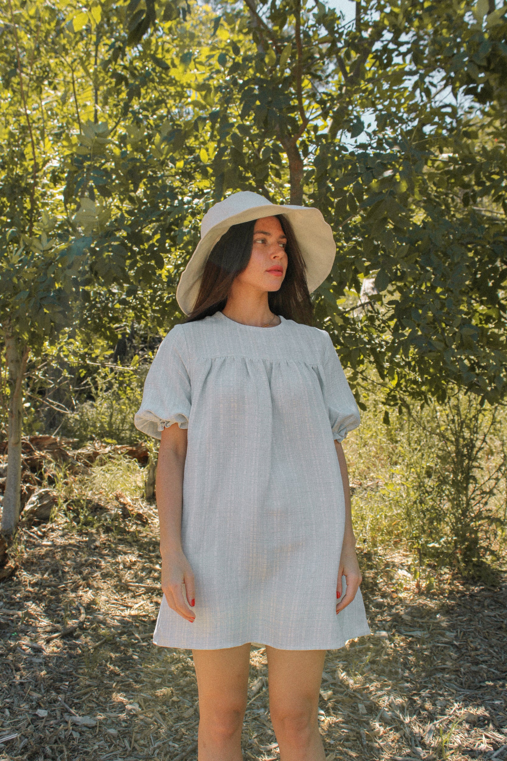 Our Hana dress is named after our founder's favorite place in Maui. The Hana is a mini babydoll dress that features a square yoke with vintage button detailing, and an above-the-elbow-length puff sleeve. The Hana can be worn with buttons in front or back—your choice! The body is a shift-style babydoll cut that is flowy and universal. Available in two color ways: Milk and Sky.