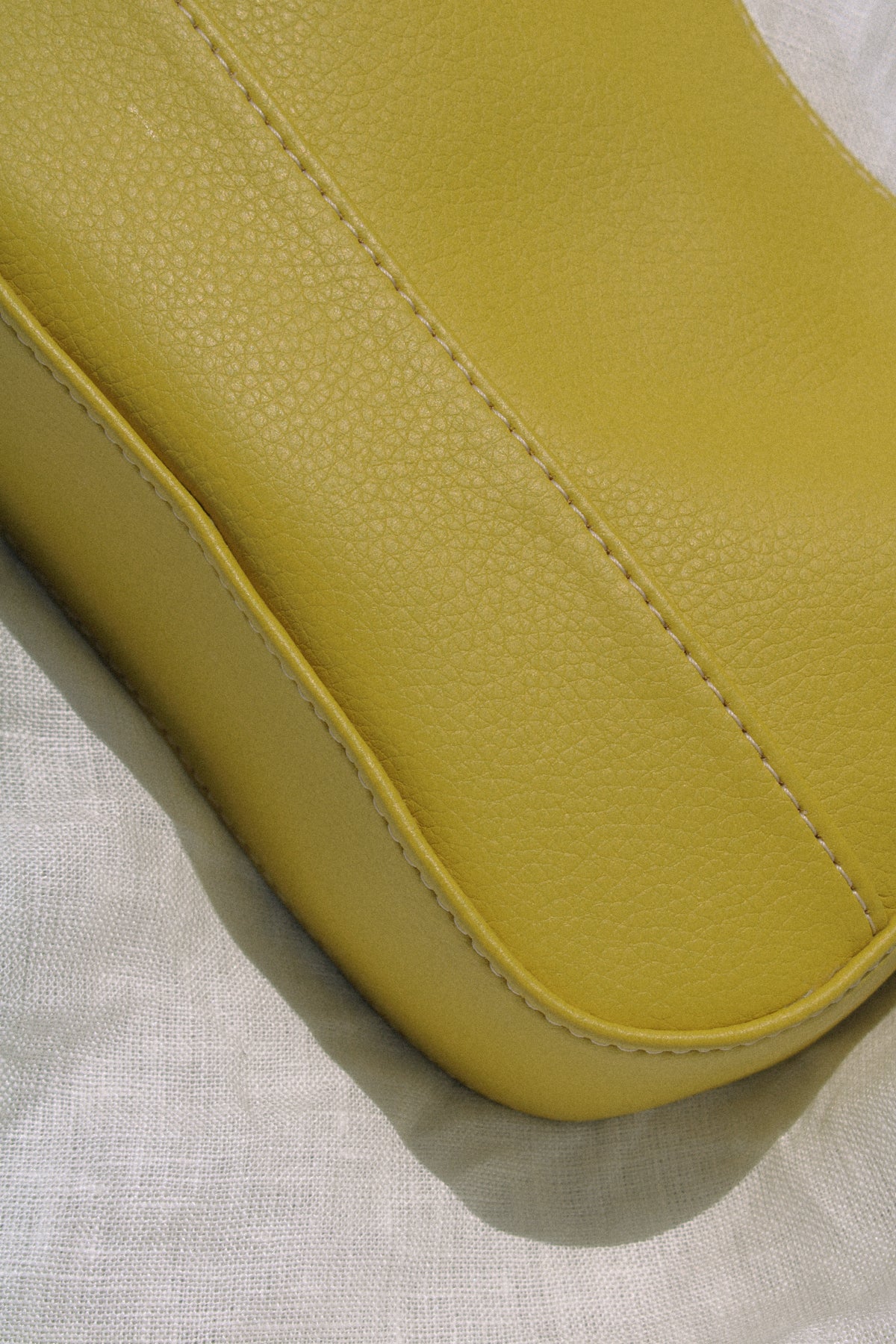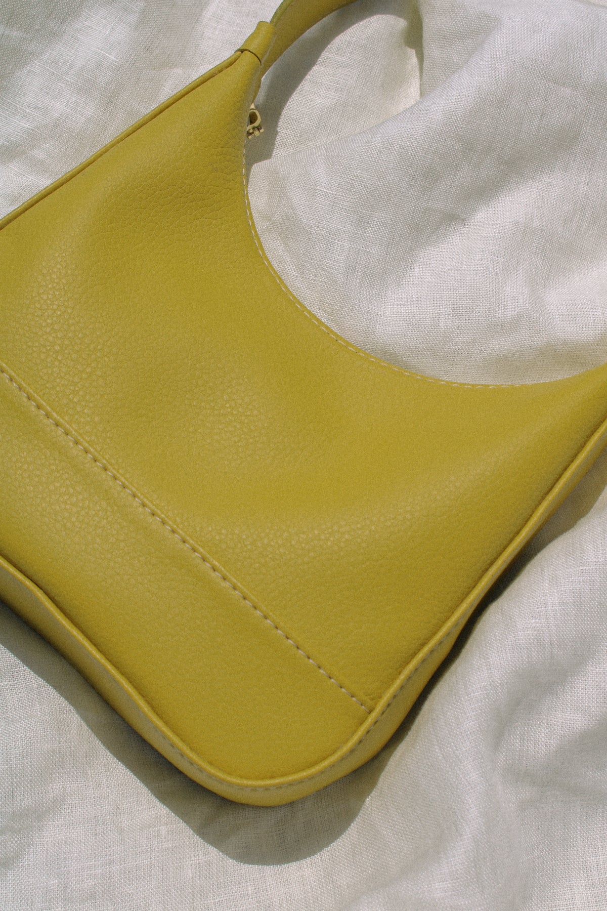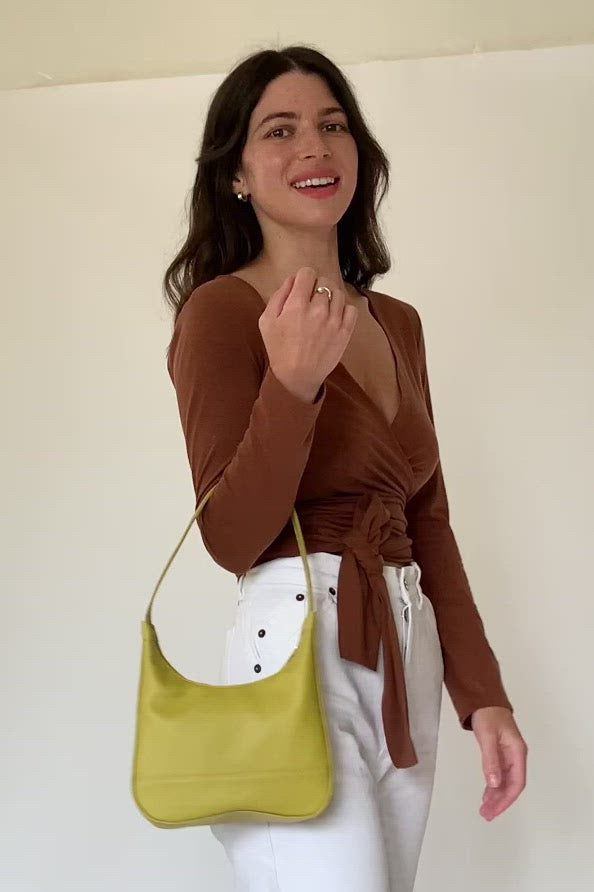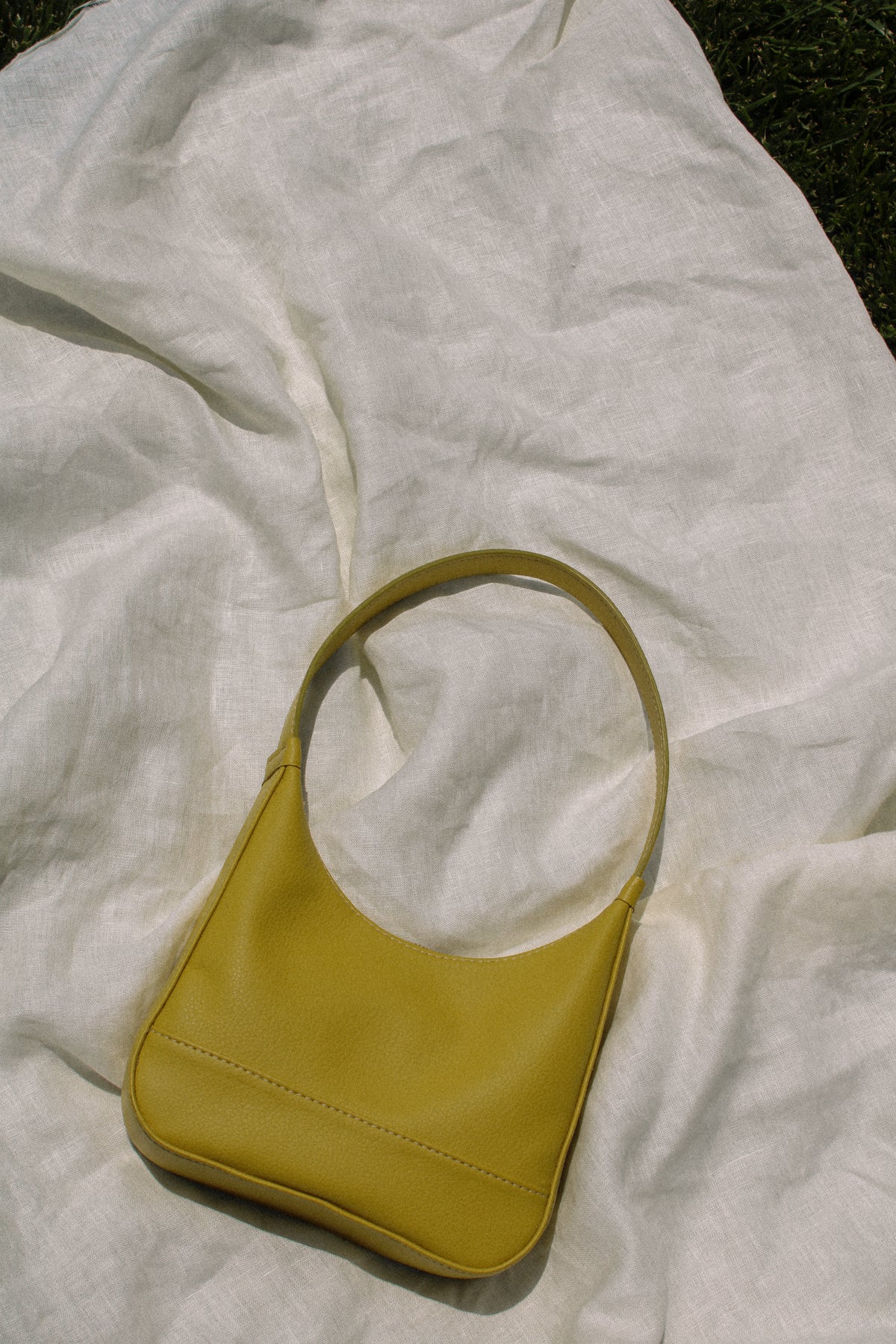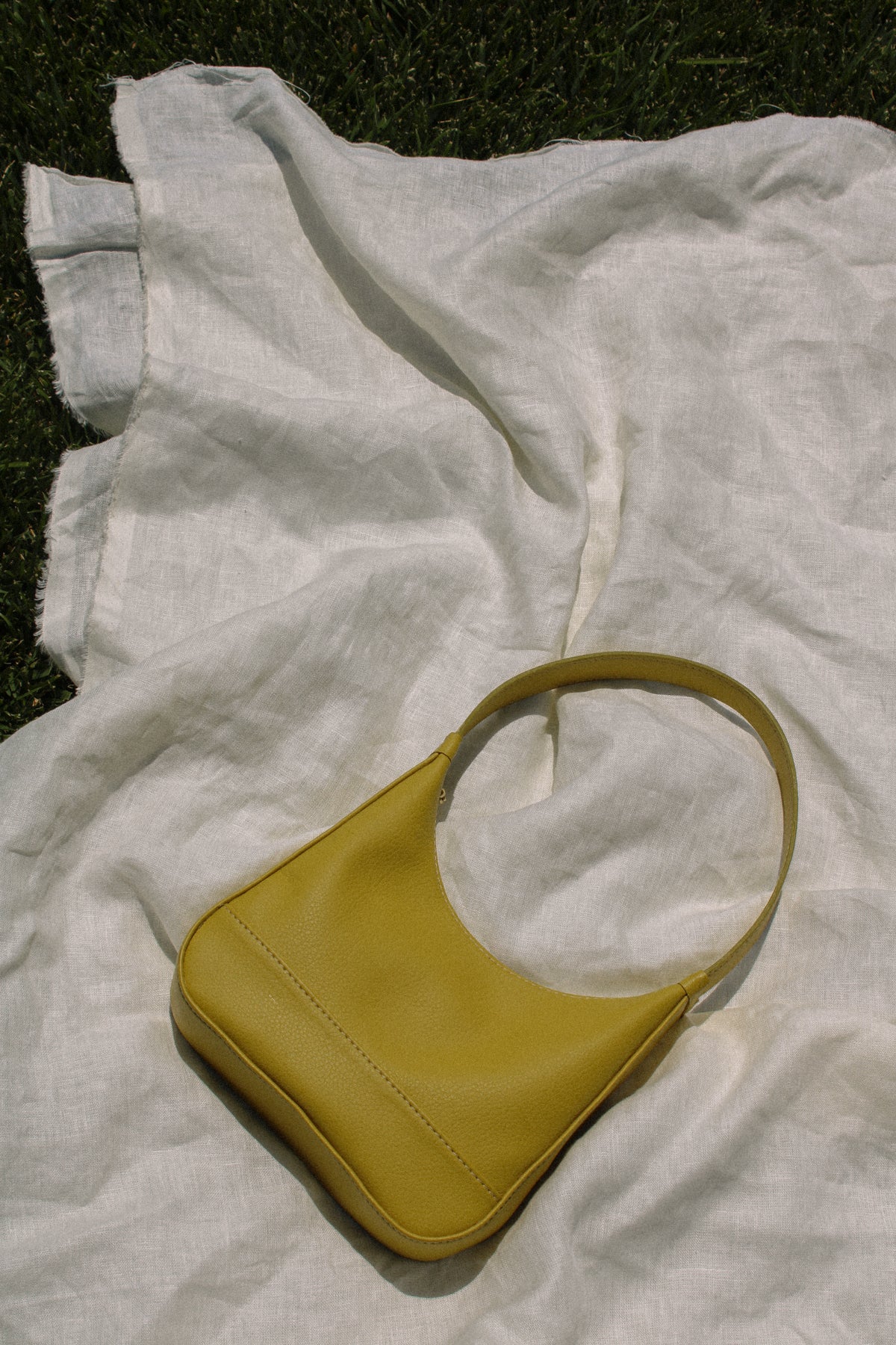 Meet the Frida Shoulder Bag. Inspired by those perfectly compact 90s bags, the Frida is the perfect size and made using deadstock faux leather. Dress up or down, she's universally appropriate for any occasion. Shown here in our Cubanelle color way, a subdued matte lime.  The Frida bag is also available in Pebble, Peppercorn, and Sisal.  Made sustainably and ethically in Los Angeles by our artisan bag maker, Lidia.