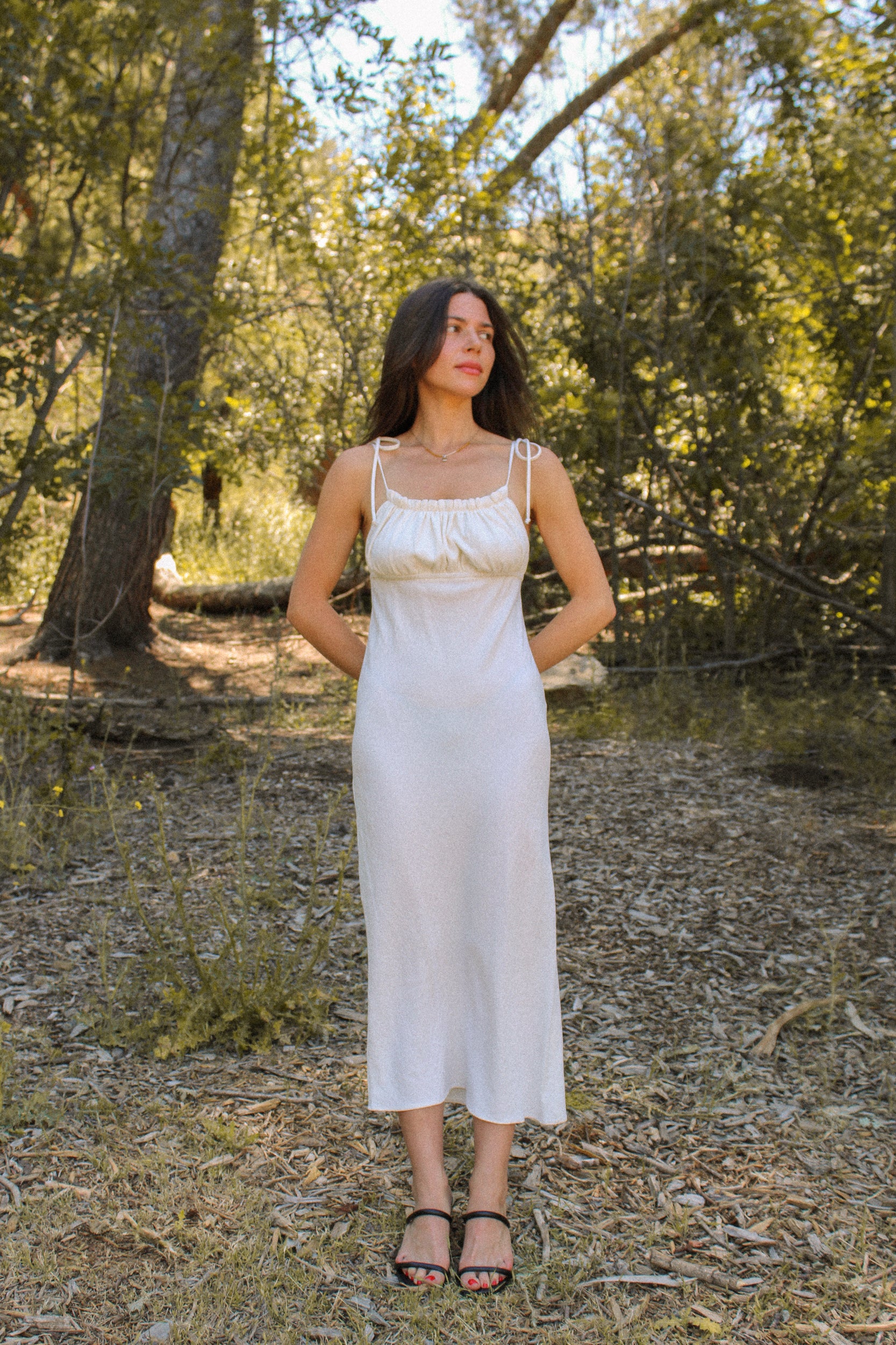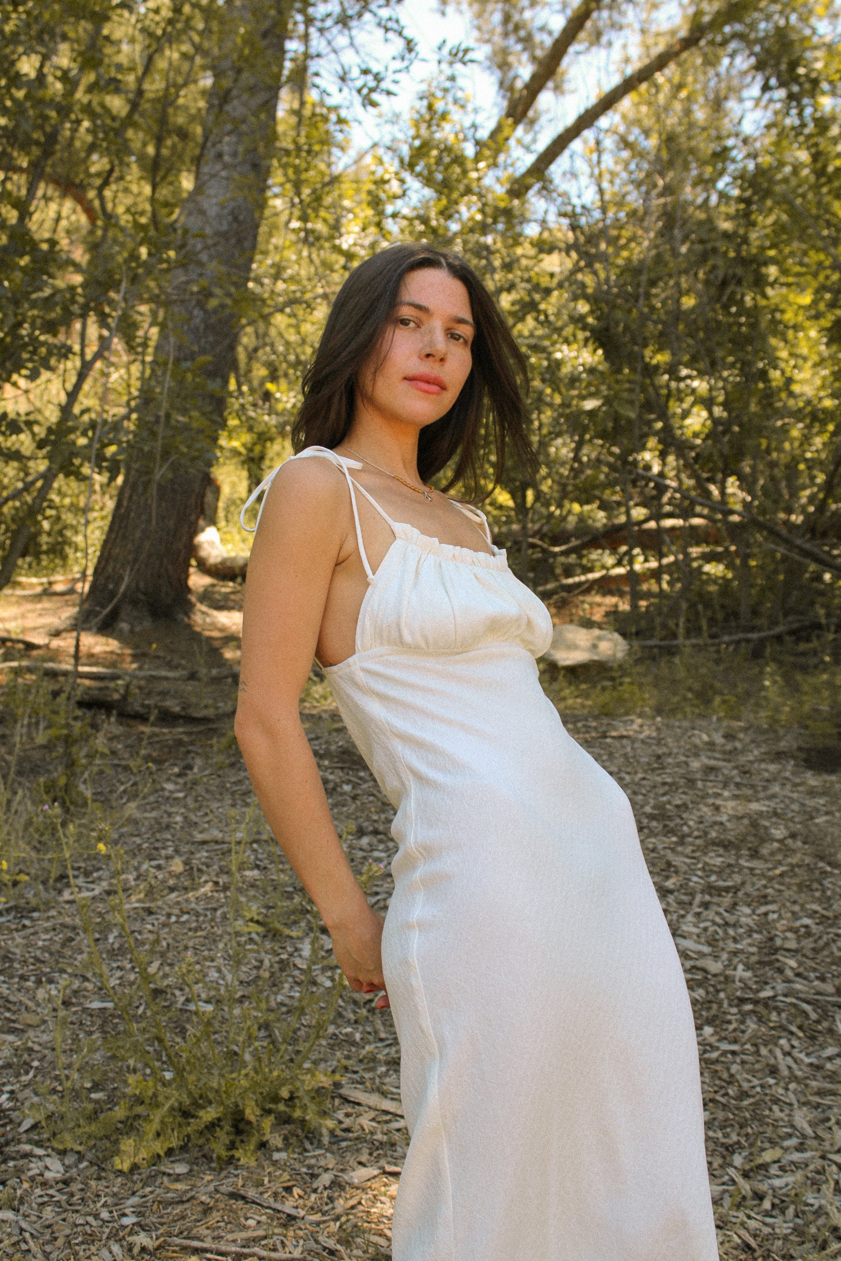 She's back. Our Mara Dress is a midi, non-silk version of our best selling Frankie Dress. Made from hand-sourced deadstock fabric, the Mara Dress is a bias cut midi dress perfect for warmer weather. Currently available in two color ways: Milk and Umber. Ethically & sustainably handmade in LA.