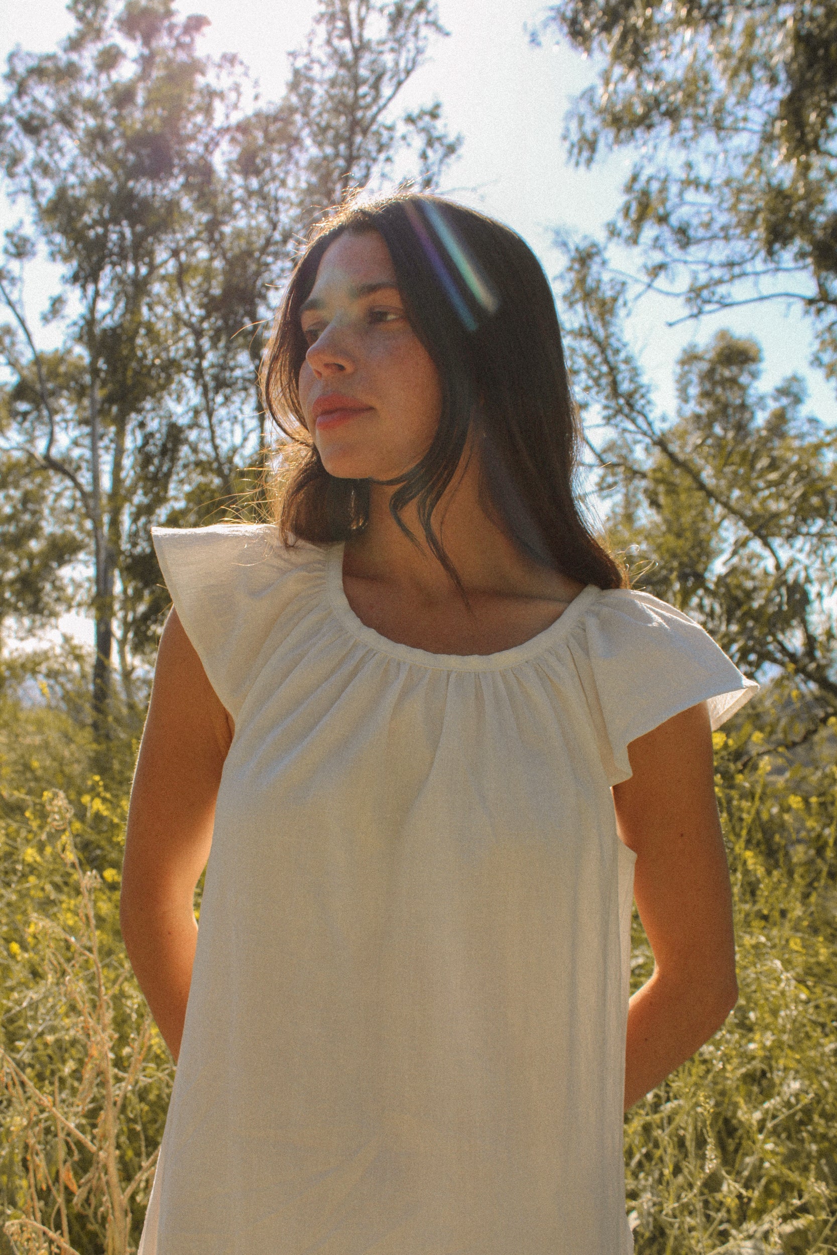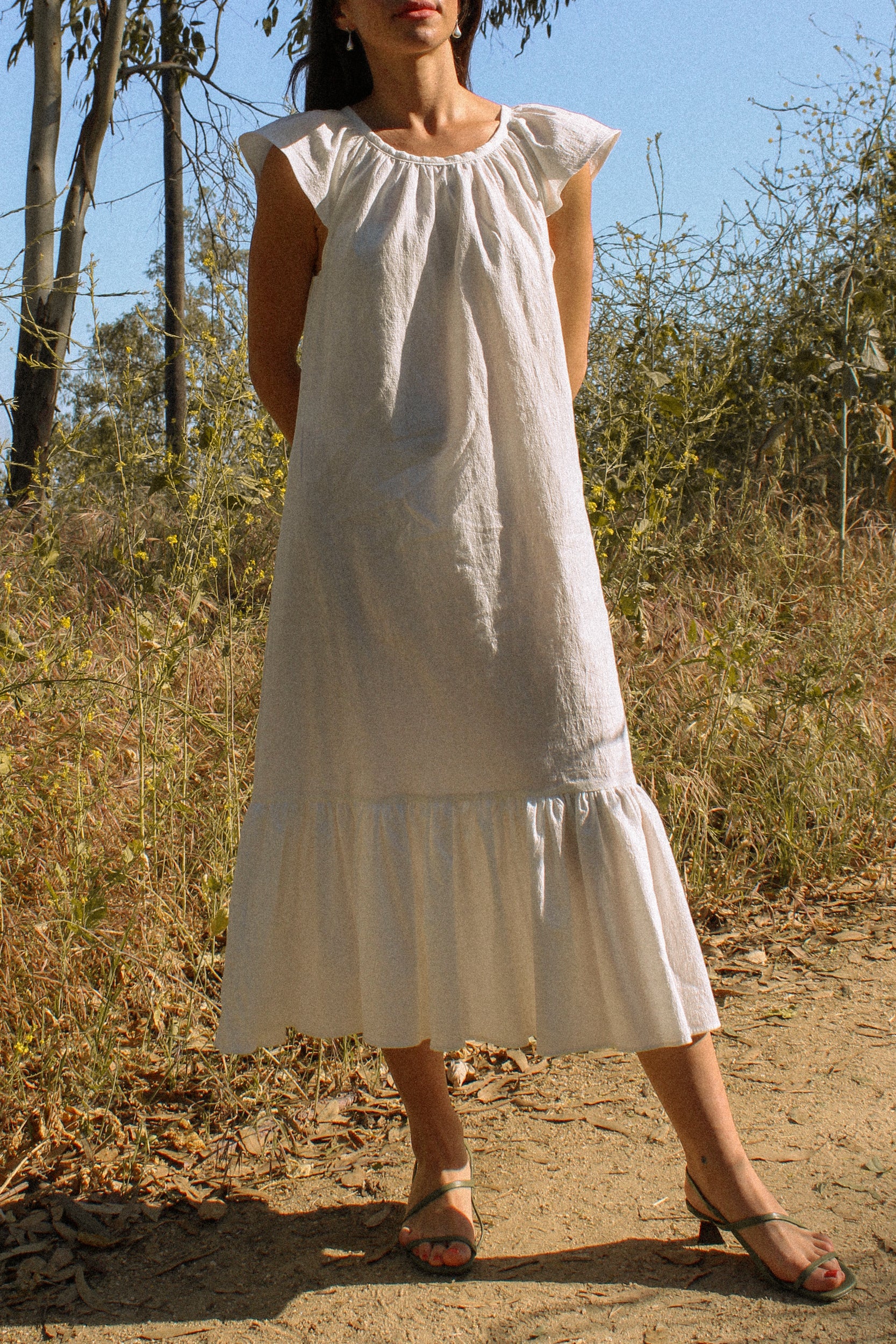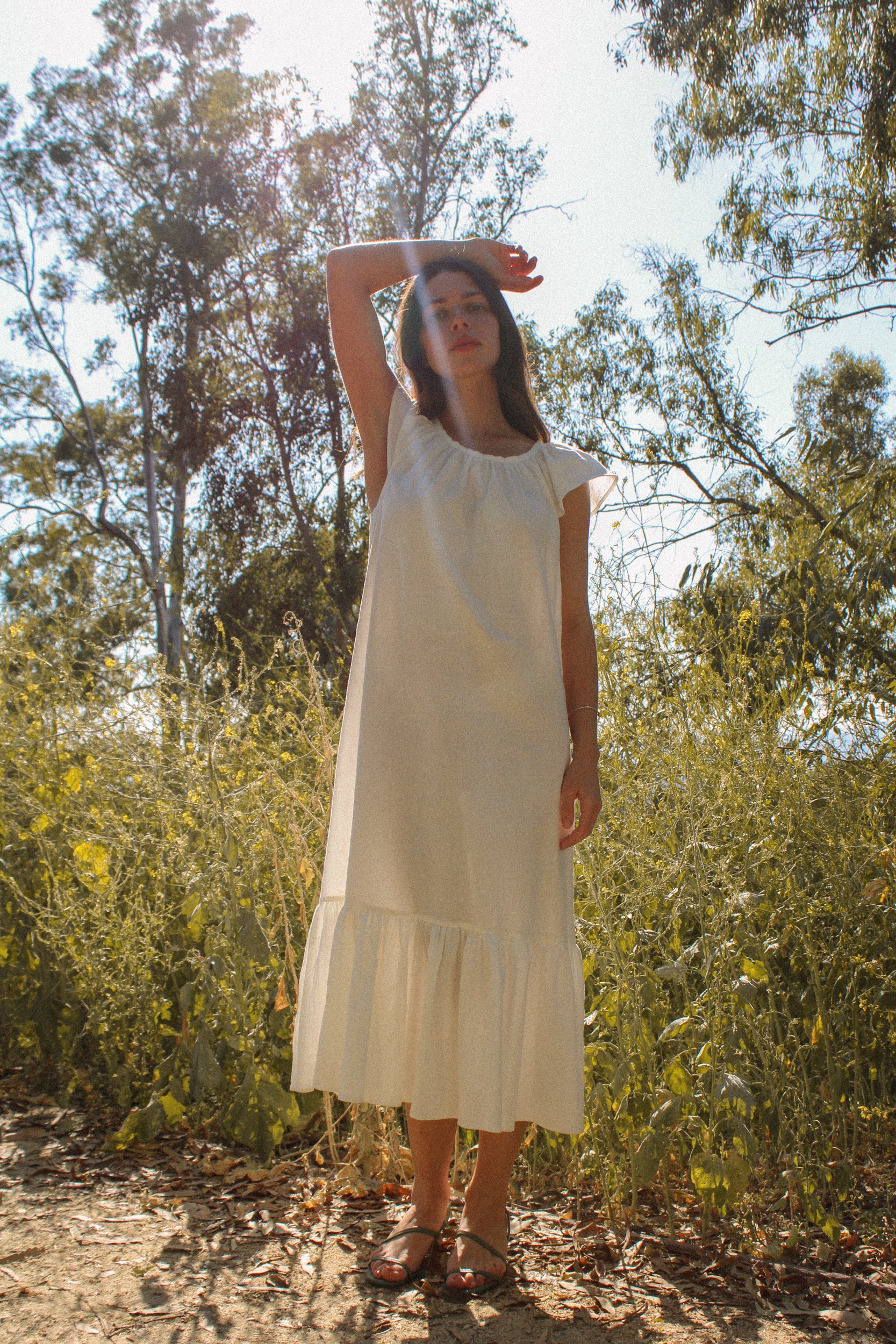 Inspired by meadows, farmer's markets, and Topanga Canyon. Our Topanga Midi Dress is a smocked-style midi dress with a gathered neckline, and ruffle hem. The sleeves are naturally flounced. Available in two cotton blend color-ways: Oat & Pepper. Ethically & sustainably handmade in LA.